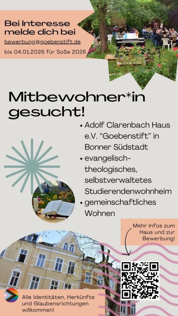 Obwohl das Adolf-Clarenbach-Haus ein evangelisch-theologisches Wohnheim ist, sind alle Studierenden anderer Fach- und Glaubensrichtungen bei uns herzlich willkommen! Auch wenn Du nicht in Bonn eingeschrieben bist, sondern z. B. in Köln oder im Rhein-Sieg-Kreis, kannst du dich gerne bei uns bewerben.